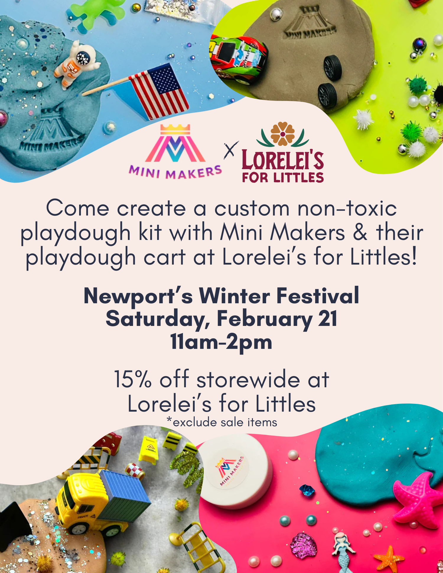 Mini Makers will be popping up at Lorelei’s for Littles with their DIY play-dough kit cart! Come create a custom non-toxic sensory play-dough kit. that makes for a fun winter activity or a great gift for others!