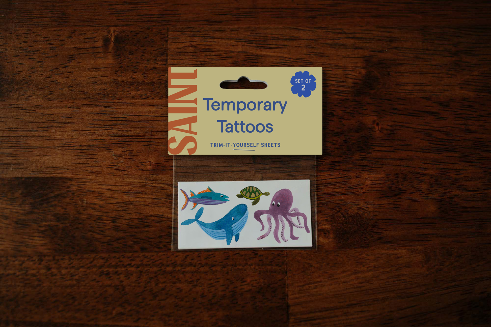 Calling all sea lovers! This temporary tattoo set features a fish, a whale, a turtle, and an octopus.